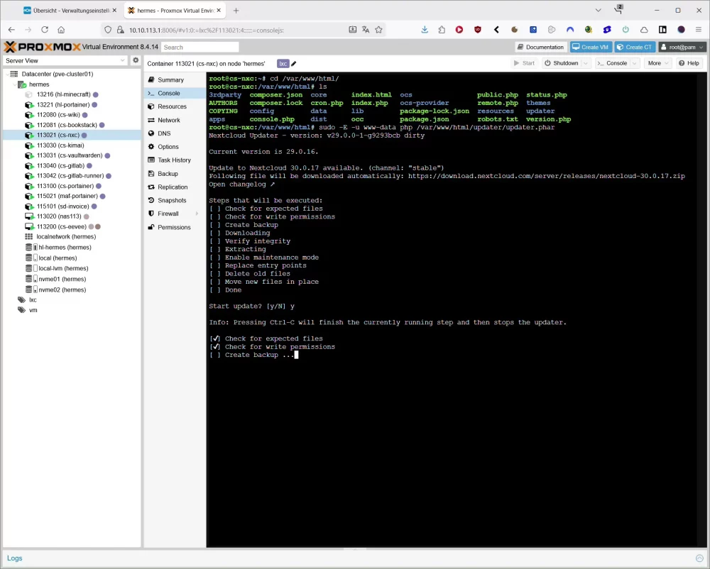 Wenn du mit Proxmox arbeitest, ist ein Snapshot oder ein vollständiges Backup des Containers vor jedem Nextcloud Server Update meist die bequemste Lösung.