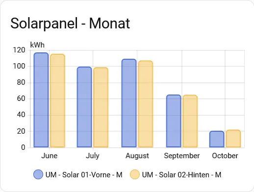 | Monat | Solar 01 (kWh) | Solar 02 (kWh) | Summe (kWh) | Ersparnis € bei 0,35 |