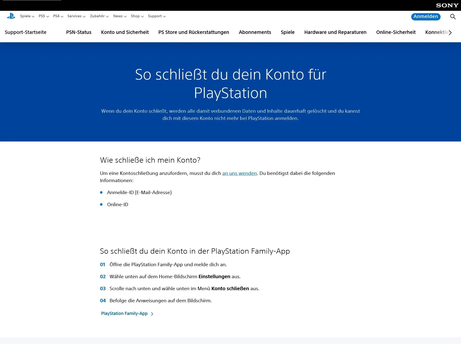 Die Schließung muss beim PlayStation Support angestoßen werden. Halte dich an die dort abgefragten Daten zur Identitätsprüfung und bestätige den Antrag auf Kontoschließung. Je nach Situation erfolgt die Kommunikation per Chat oder Formular. - Alternative über die PlayStation Family App