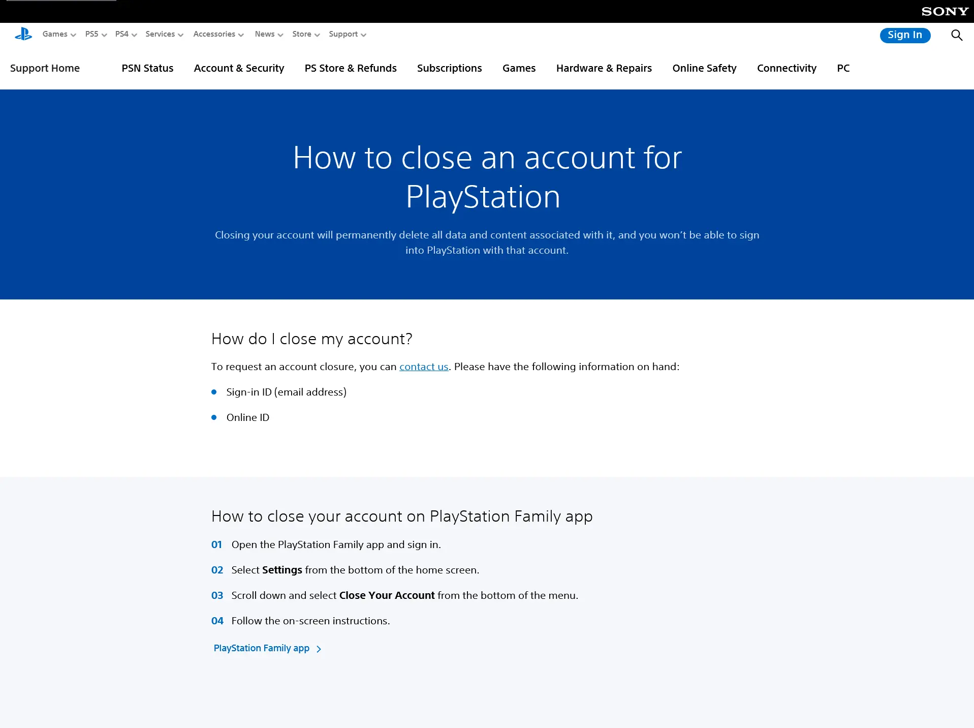The closure has to be initiated with PlayStation Support. Follow the identity check, provide the requested details and confirm the closure request. Depending on your case this happens via chat or a form.