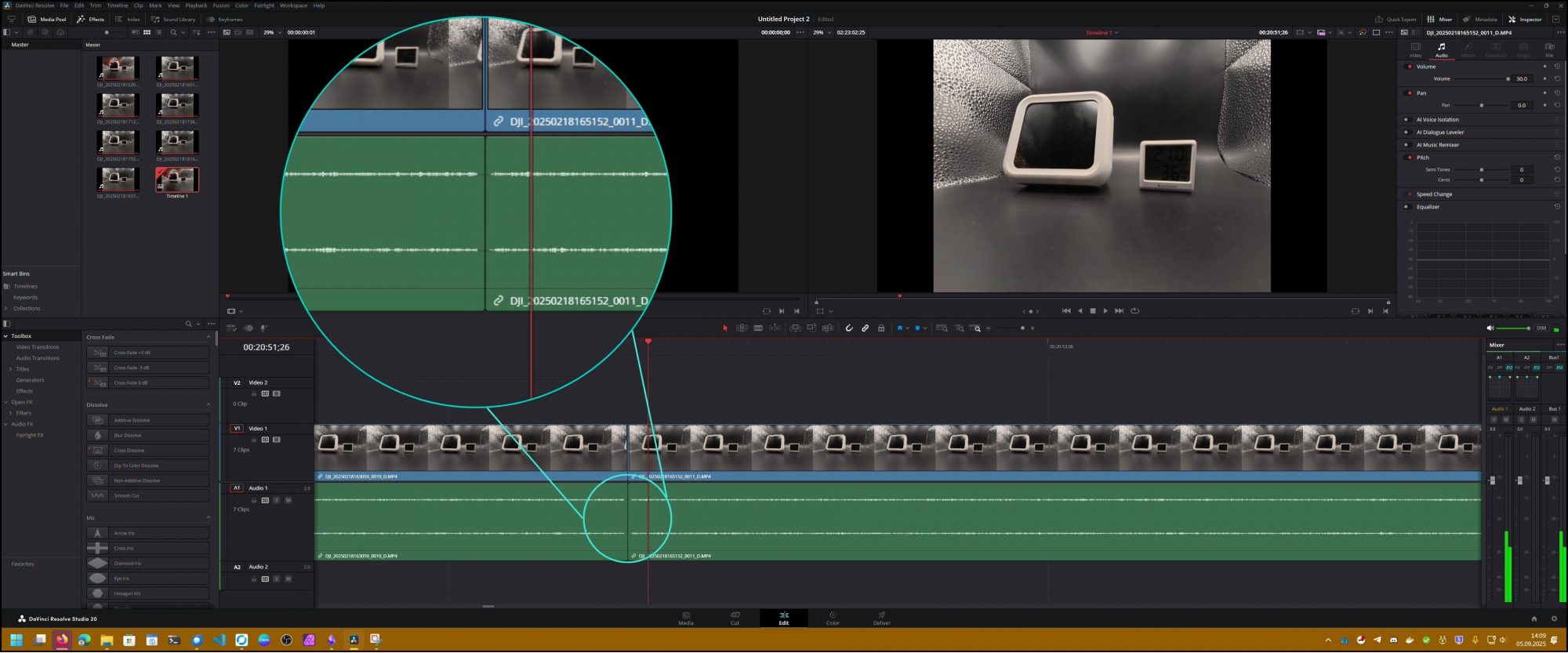 When stitching split clips together (e.g. in DaVinci Resolve (*) ), audio and video may drift slightly. Possible causes: